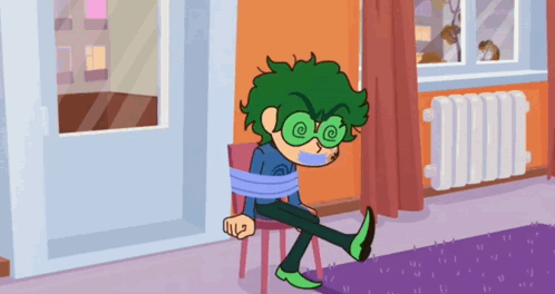 Cartoon character Varu Waru with green hair tied to a chair, mouth taped, eyes spiraling in a dazed state.