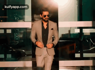 Actor Nagashaurya looking sharp in a grey suit and sunglasses, from Varudu Kaavalenu.