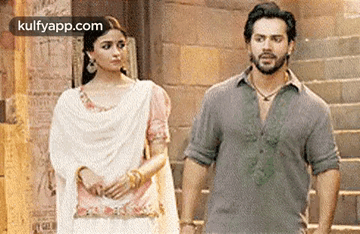 Varun Dhawan and Alia Bhatt stand together in a scene from the movie Kalank, looking contemplative.