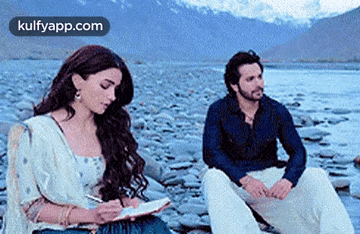 Alia Bhatt writing in a notebook while Varun Dhawan sits beside her on a rocky riverbank, a scene from Kalank.