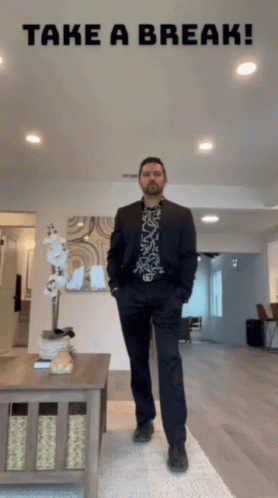 Varun Realtor stands in a modern living room, encouraging viewers to 'TAKE A BREAK!' from work stress.
