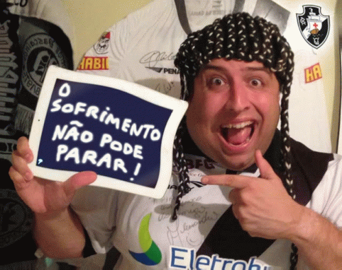 A passionate Vasco fan, wearing a team jersey and a braided wig, holds a sign saying 'The suffering cannot stop!'