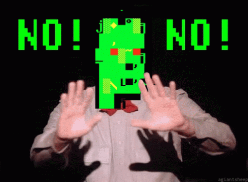 Vdospunks Dos Punks pixel art character with red eyes says NO! NO! with hands up.
