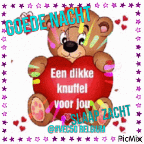 A cute teddy bear holds a red heart with a 'Good Night, A big hug for you, Sleep Softly' message.