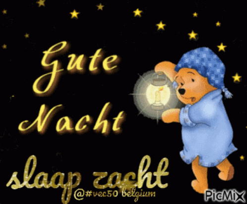 Vec50 presents Winnie The Pooh holding a lantern under a starry sky, with 'Gute Nacht Slaap Zacht' text.