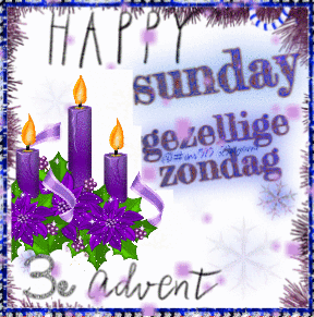 Happy Sunday greeting for the 3rd Advent, featuring purple candles and a festive wreath.