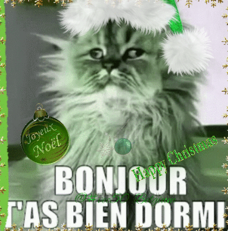 A fluffy cat wearing a Santa hat offers a festive 'Merry Christmas' and 'Good Morning' greeting in French and English.