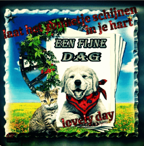 A cheerful animated greeting with a dog and cat, featuring Dutch text 'Een Fijne Dag' and 'lovely day'.