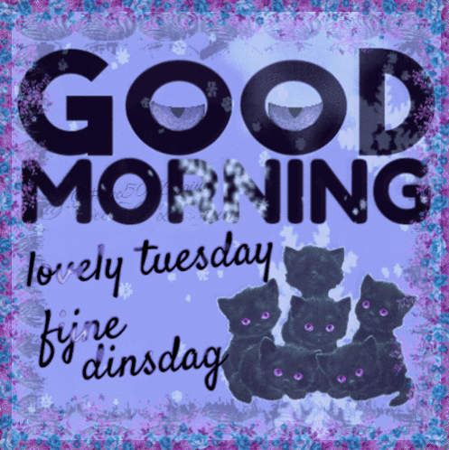 Animated graphic wishing a 'Good Morning Lovely Tuesday' with cute black cats and Dutch greeting.