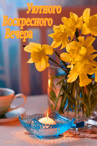 A cozy evening scene with vibrant yellow daffodils in a vase, a lit candle in a blue holder, and a cup.