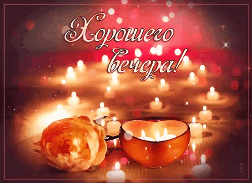 A warm greeting card featuring a heart-shaped candle, a beautiful rose, and many glowing candles, wishing 'Have a good evening!'