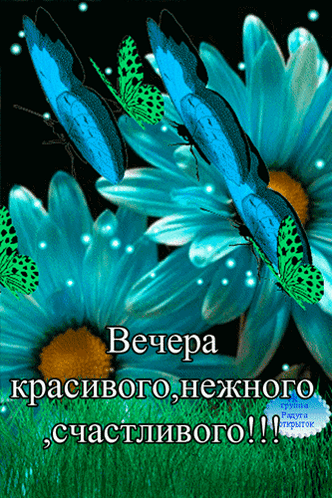 Animated greeting with vibrant blue flowers and green butterflies, wishing a beautiful, tender, and happy evening.