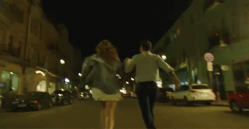 Misha Marvin and a woman happily running down a city street at night during an evening walk.