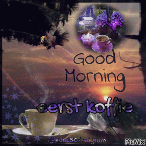 A beautiful 'Good Morning' graphic featuring coffee cups, vibrant flowers, and delicate butterflies against a sunrise backdrop.