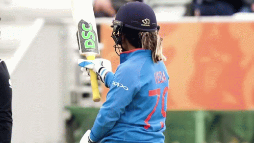 Veda Krishnamurthy celebrates her half-century in an India Women's Cricket match, raising her bat.