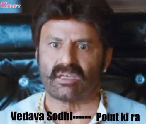 Bala Krishna from Legend Movie reacts with an intense expression, saying "Vedava Sodhi Point Ki Ra" (Useless talk, come to the point).