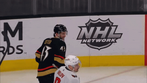 Paul Cotter, player for the Vegas Golden Knights, smiles on the ice in front of an NHL Network sign.