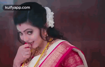 Actress Athulya Ravi in a pink and white saree, shyly biting her finger, a 'Vekkam' moment.