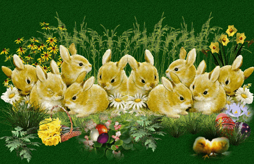 Rabbits in a field with flowers and eggs, celebrating Easter and the arrival of spring.