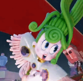 Velvet, the vibrant character from Trolls Band Together, with her distinctive green hair and elaborate outfit.