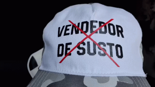 A man wearing a hat that says "Vendedor de Susto" with a red cross, then makes a funny face.