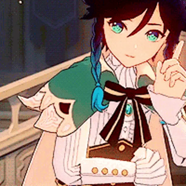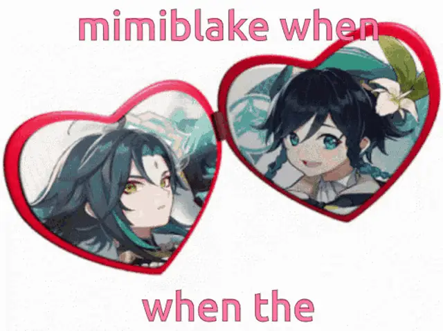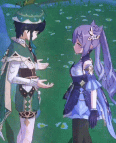 Venti and Keqing from Genshin Impact share a sweet moment in a grassy field.