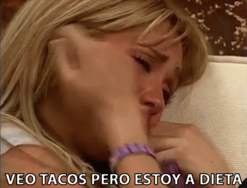 Anahí, as Mia Colucci from Rebelde, crying because she sees tacos but is on a diet.