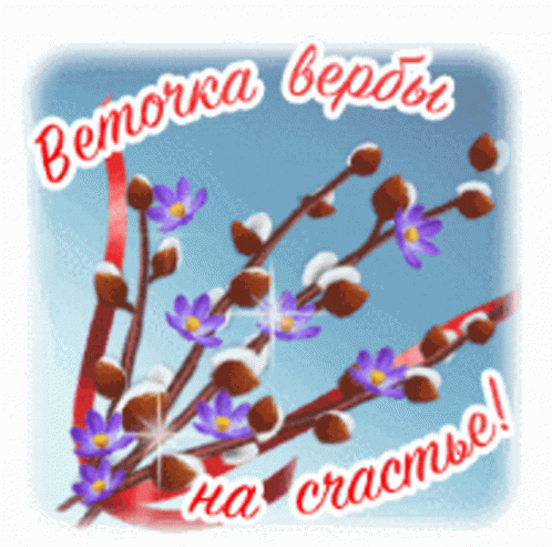 Animated pussy willow branches with purple flowers and a red ribbon, featuring the Russian text 'Pussy willow branch for happiness!'