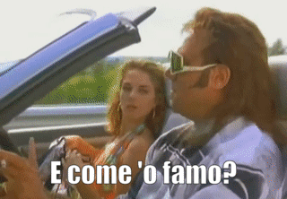 Verdone asks 'E come 'o famo?' and replies with the iconic 'O famo strano' while driving a convertible.