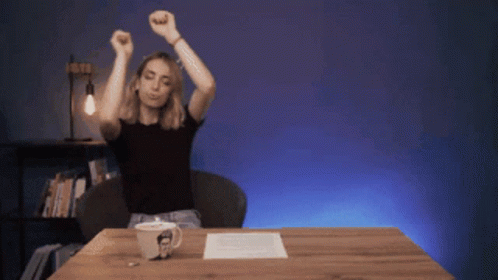 Verena Mischitz, an Austrian journalist, is seen dancing and celebrating enthusiastically at her desk.