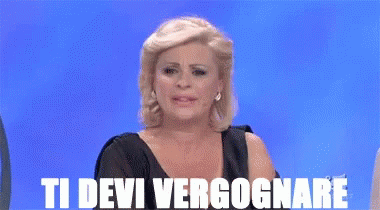 Tina passionately exclaims 'Ti Devi Vergognare' (You Should Be Ashamed) on a blue background.