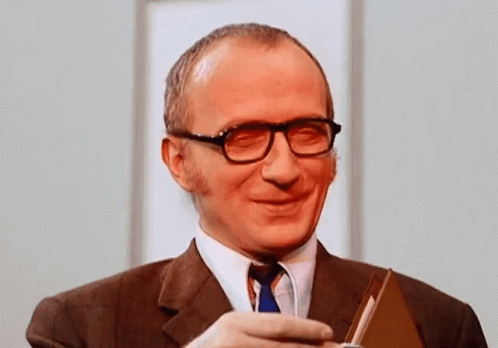 A man in glasses and a suit smiles shyly while holding a book, appearing slightly embarrassed.
