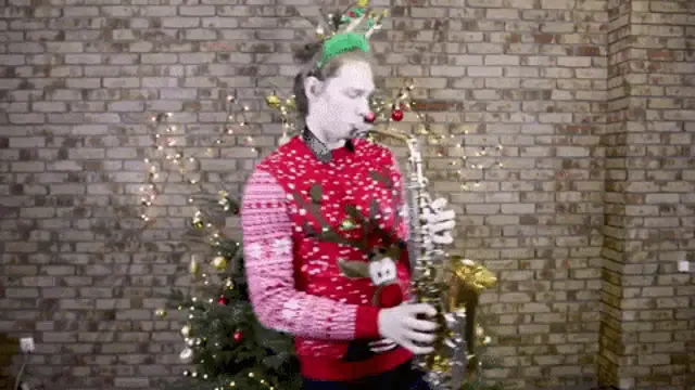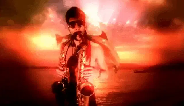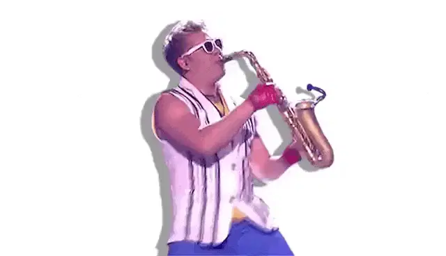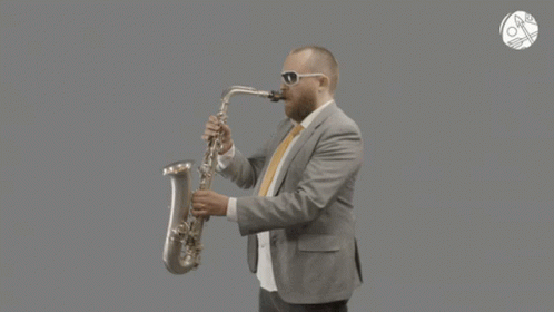 Epic Tax Guy from Verohallinto plays a saxophone in a suit and sunglasses against a gray background.