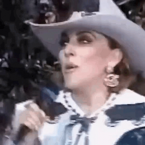 Veronicacastro passionately shouts or sings into a microphone while wearing a white cowboy hat and earrings.