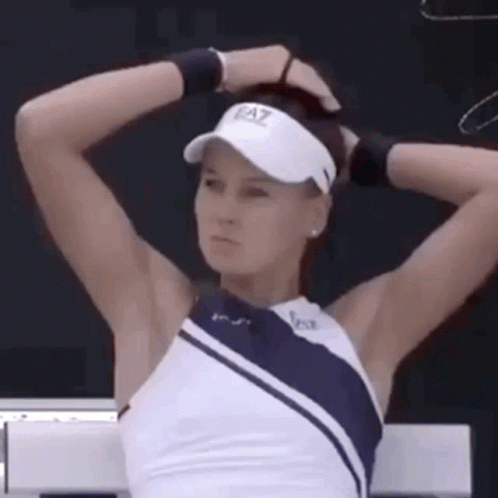 Veronika Kudermetova fixes her ponytail during a tennis match, wearing her white visor and outfit.