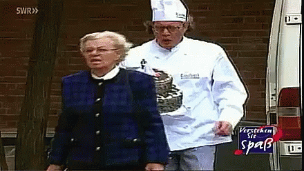 A chef appears to almost drop a large cake on an unsuspecting woman as part of a hidden camera prank.