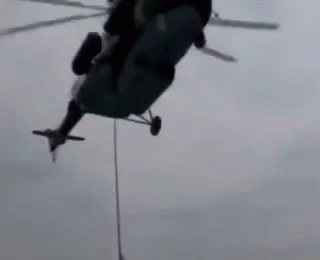 A Russian GRU Spetsnaz operative fast-ropes from a military helicopter during a training exercise.