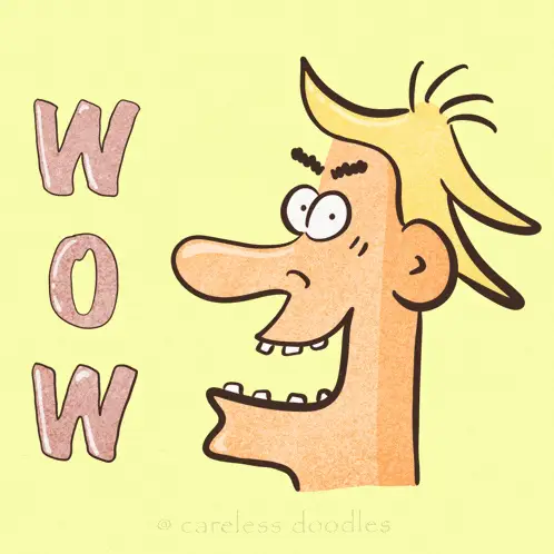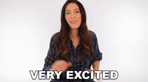 Shea Whitney expresses extreme excitement with a wide smile and open hands, wearing a stylish plaid shirt.