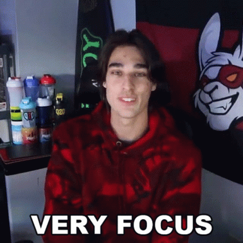 Surfnboy, a young man in a red hoodie, sits with 'VERY FOCUS' text displayed, surrounded by shaker bottles.