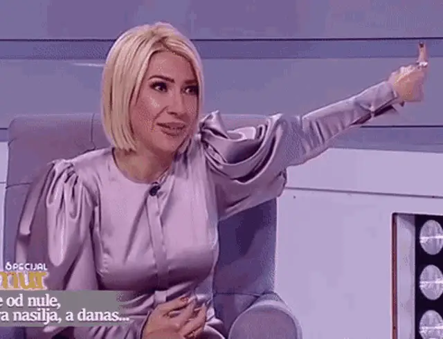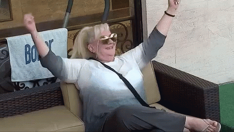 Vesna Rivas sitting on a couch with arms raised, smiling, with a towel that says 'Bono' next to her.