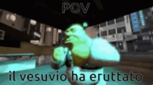 Shrek in a boxing ring with the Italian caption 'POV: il vesuvio ha eruttato' (Mount Vesuvius has erupted).
