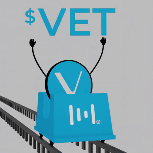 An animated Vechain ($VET) coin character enjoys an exciting ride on a crypto-themed roller coaster.