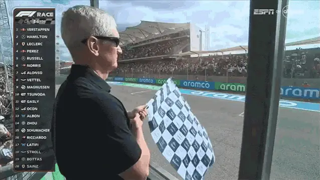 loadingTim Cook Waving Checkered Flag at Formula 1