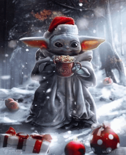 Baby Yoda, also known as Grogu, in a Santa hat holding a mug, with 'Go Knights Go!' text in a snowy scene.