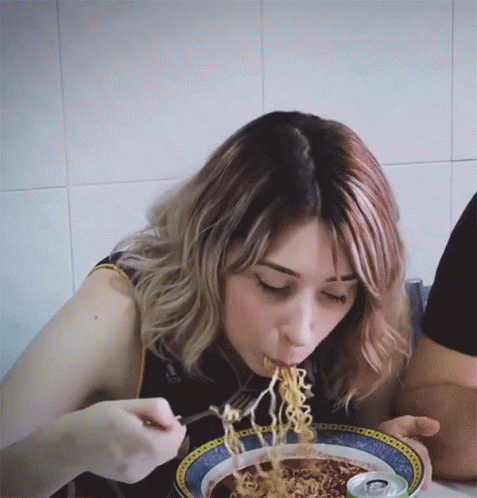 Elena Bunny, part of Vi Tuber Pareja, is seen eating a large bowl of ramen noodles with a fork.