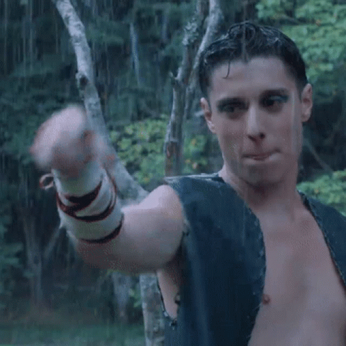 Vic Marégeek, shirtless and wearing a vest, stands in a lush forest, moving rhythmically in the rain.
