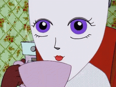 The cartoon character Vichy sips coffee from a pink cup, then spills it down its chin in a messy moment.