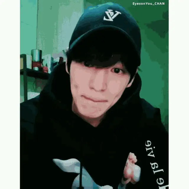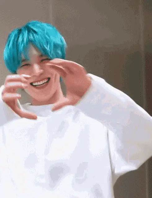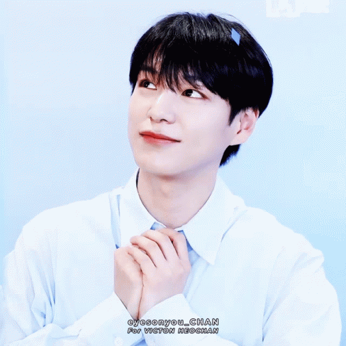 VICTON's Heochan looks up with a sweet smile, hands clasped, wearing a light blue shirt.