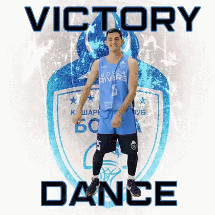 Basketball player Ilija Nenadic performs a victory dance, celebrating with Borca Rivers.