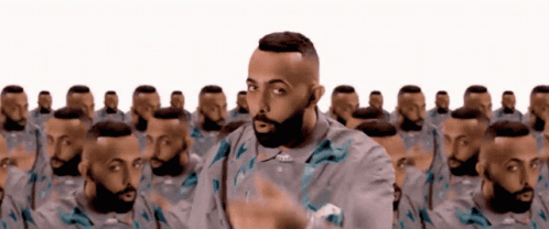 Eladio Carrion in 'Vida Buena Remix' video, surrounded by a crowd of his clones, pointing at the viewer.